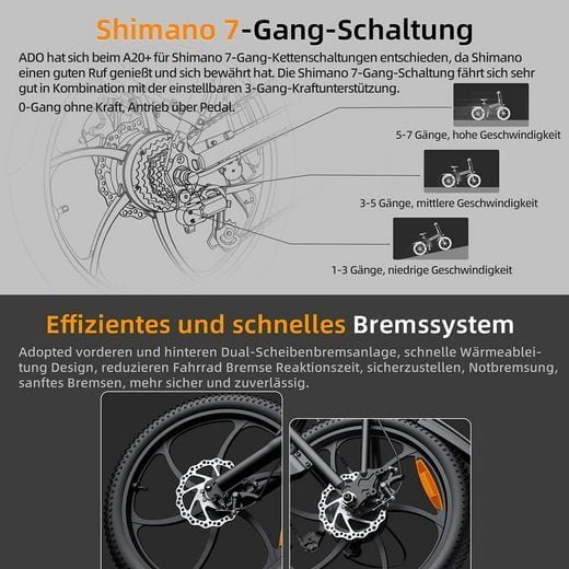 • Bremse und 7-Gang-Getriebe: Mechanische Scheibenbremsen vorne und hinten. Das Shimano 7-Gang-Getriebe.