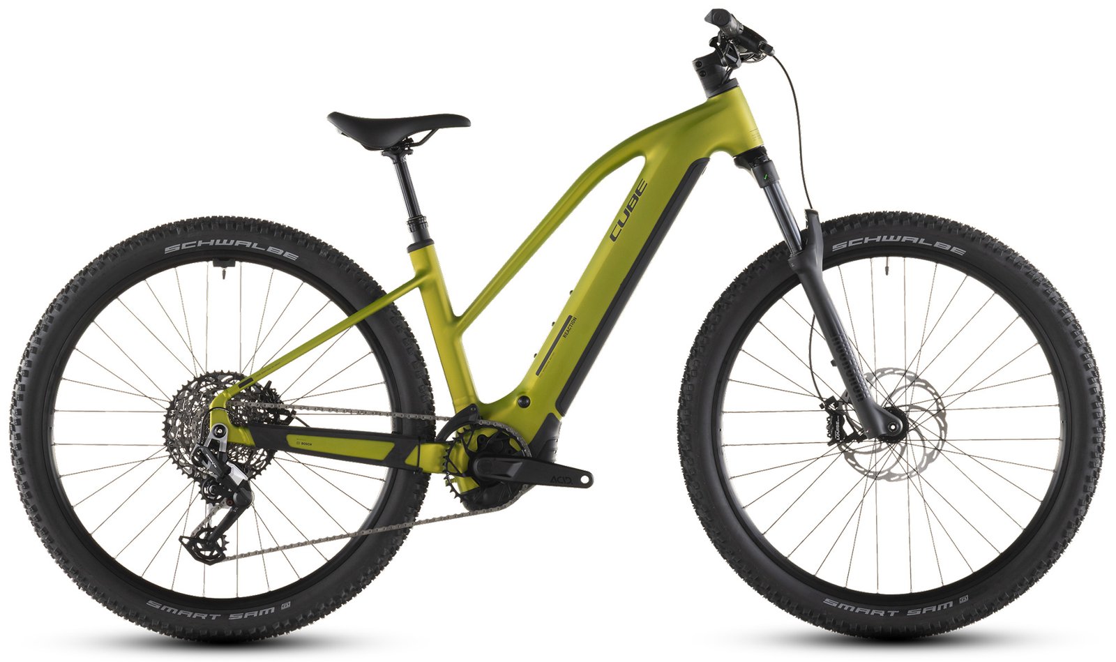 Mit seiner robusten Konstruktion und dem 800 Wh starken Akku meistert das Cube Reaction Hybrid Race alle Routen souverän. Zudem ist dieses E-Hardtail PowerMore-ready, das heißt, es können bei Bedarf weitere 250 Wh für noch mehr Reichweite mitfahren. Sein Bosch CX Motor Smart System mit 100 Nm Drehmoment ist für tatkräftige Unterstützung im Vorwärts zuständig, dabei hat die 12-fach Sram Transmission 90 für jede Situation unterwegs den richtigen Gang parat. Für höchsten Fahrkomfort und 1a-Kontrolle hat Cube 2.6 Zoll breite, griffige Schwalbe Pneus und eine Rockshox Recon Silver Luftfedergabel verbaut. Apropos Kontrolle: Die hydraulischen 4-Kolben-Scheibenbremsen packen bei Bedarf kräftig zu und verzögern das Bike bei allen Bedingungen zuverlässig und sicher – und eine versenkbare Sattelstütze ist auch mit dabei. Gern abseits markierter Wege unterwegs? Dann nichts wie los!