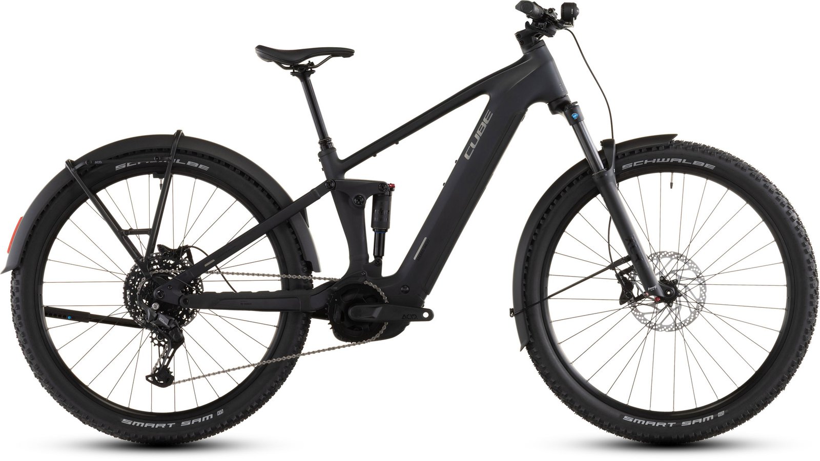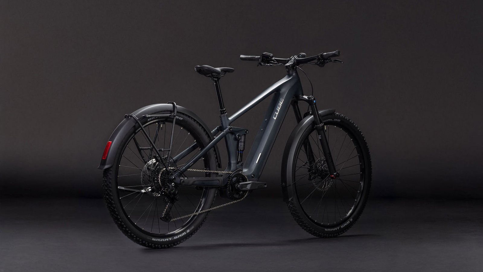 Das Cube Stereo Hybrid ONE22 Pro 600 FE ist ein Bike für alle Fälle: Bei schlechtem Wetter halten die Schutzbleche Schmutz und Spritzwasser ab. Der semi-integrierte Gepäckträger bringt sämtliches Hab und Gut sicher von A nach B, ob auf dem Weg zur Arbeit oder bei der Radtour am Wochenende. On top gibt’s einen Seitenständer und Lichter. Damit das Bike auf Trails geschmeidig dahinrollt, hat Cube eine Luftfedergabel und den dazu passenden Dämpfer verbaut. Außerdem mit an Bord: ein leistungsstarker Bosch CX Motor mit 100 Nm Drehmoment, Purion 200 Display und 600 Wh Akku für top Unterstützung auf allen Routen. Diesen Vortrieb präzise dosiert auf den Untergrund bringt die einfach bedienbare Shimano Cues 10-Gang Schaltung. Ebenfalls von Shimano kommen die hydraulischen Scheibenbremsen, welche die griffigen Schwalbe Smart Sam 2.6 Zoll Pneus zu jeder Zeit souverän verzögern und anhalten. Und? Wo soll’s als Nächstes hingehen?
