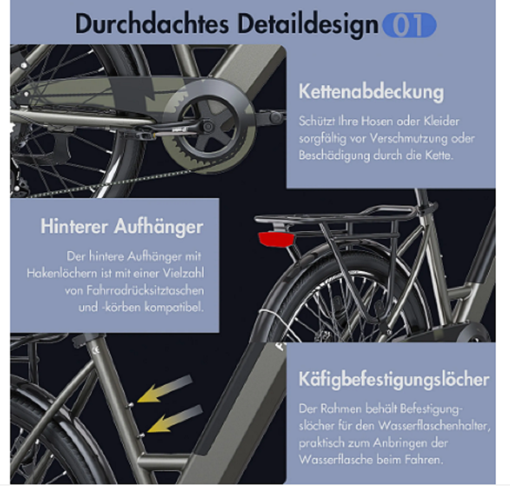 Das Fahrrad ist mit einer transparenten Kettenabdeckung ausgestattet, die Ihre Hose oder Kleidung sorgfältig vor Schmutz und Kettenschäden schützt.
