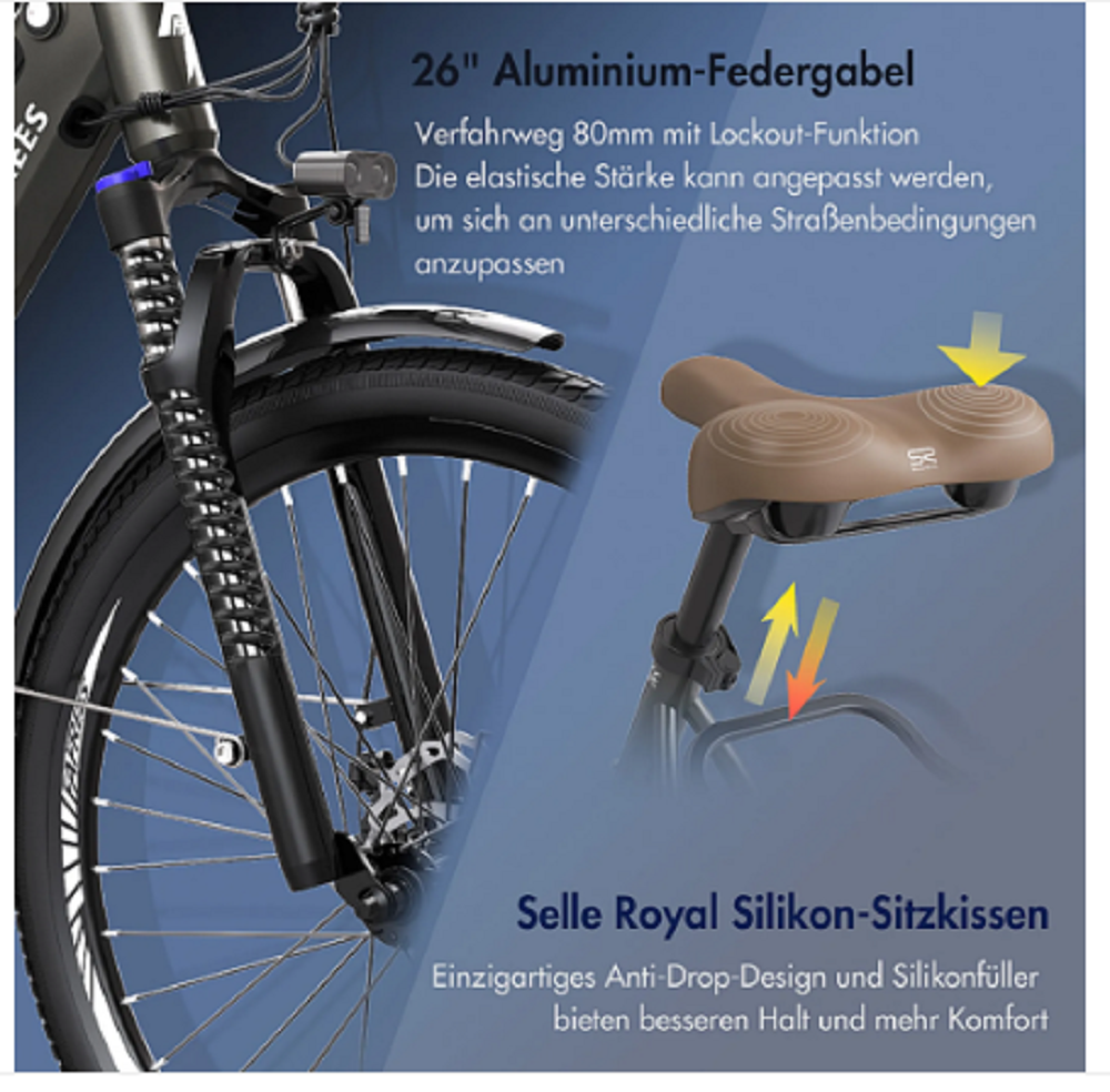 26-Zoll-Vorderradgabel (Federweg: 80 mm) mit Lockout-Funktion zur Anpassung an verschiedene Straßen.