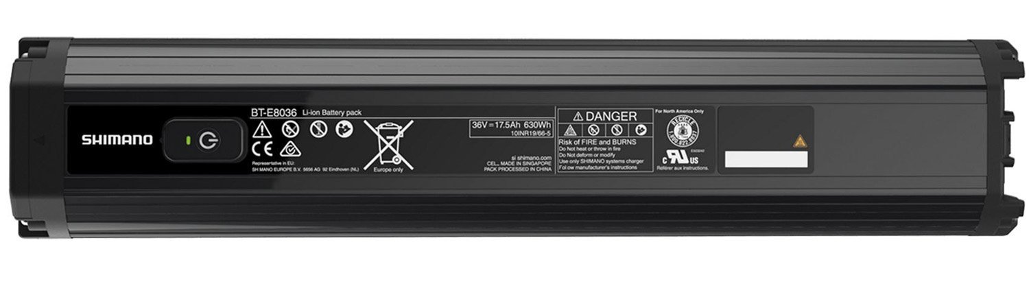 Der extrem kompakte, strapazierfähige und wasserfeste Shimano Steps Akku BT-E8036 (integriert und ermöglicht ein schlankes Rahmen-Design) besitzt ein speziell für E-MTBs entwickeltes Low-Profile-Design für mehr Stoß- und Vibrationsfestigkeit. Der Hochleistungs-Akku mit ausgezeichneter Reichweite sowie 630 Wh bietet konsistente Wiederaufladung und ist mit der SHIMANO E8000 E-MTB Serie kompatibel.
